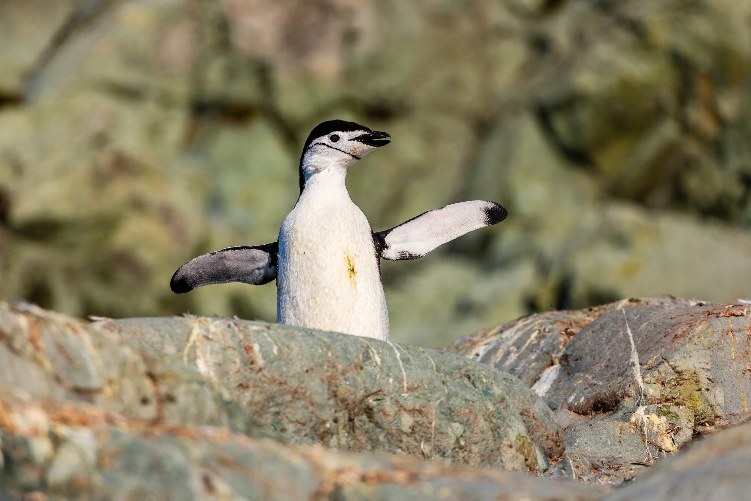 Chinstrap Penguins (Pygoscelis antarctica) are a species of penguin that are found in the Southern Ocean, primarily in the Antarctic region. They are named for the distinctive black band under their heads that resembles a chinstrap, and they are one of the smallest species of penguins. Chinstrap Penguins are social birds, living in large colonies that can number in the tens of thousands, and they are known for their noisy and aggressive behavior. They feed mainly on krill and small fish, diving to depths of up to 300 meters in search of food. Chinstrap Penguins have a distinctive appearance, with black plumage on their backs and heads, and white underparts. They are an important part of the ecosystem in the Southern Ocean, serving as a food source for predators such as leopard seals and orcas.