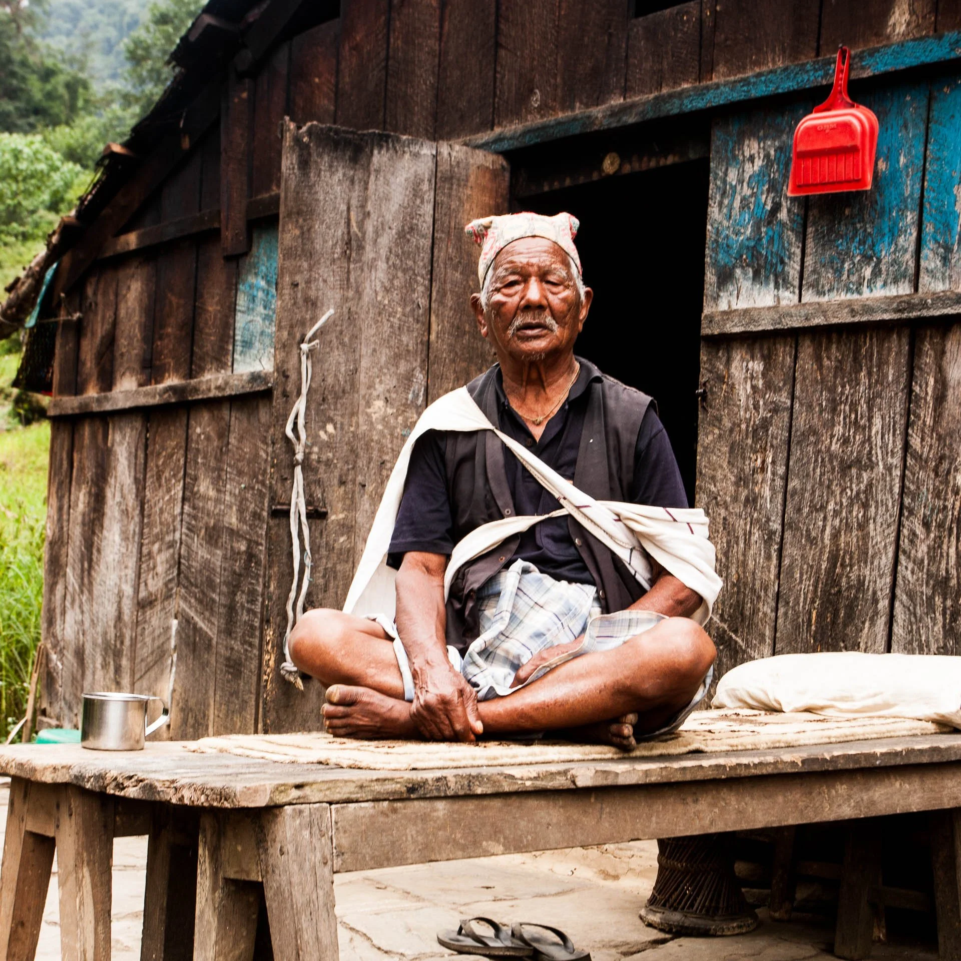 After completing this concerning bridge, which gave many of our group cuts and made them glad for the mandatory tetanus shots to travel to Nepal, we did a short hike to a “staging area” village. Situated right by a waterfall, and surveyed by a headman on his porch, I took photos of them both, before we began the final assent.