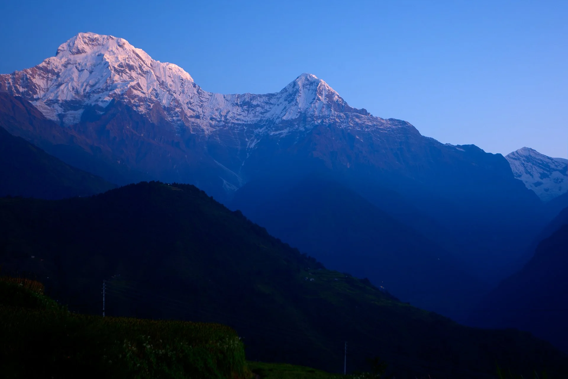 I then made my excuses, and walked about 200 meters down the mountain to a dark spot facing the valley and setup my gear to photograph and amazing scene. Annapurna as the backdrop, the two hills we spent the last two days climbing up and down on either side and below Annapurna , a town, illuminated in light on the mountainside.